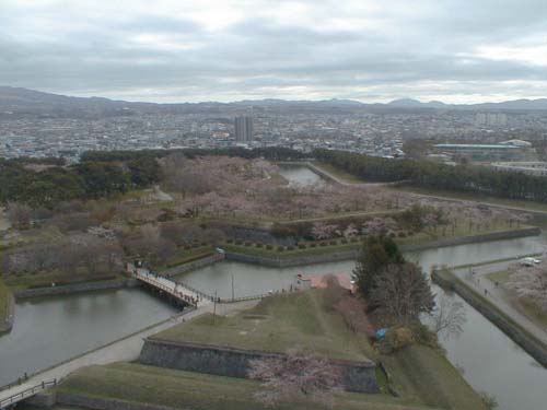 無料駐車場に入る事ができました。ここでは、有名な五稜郭のやえ桜をじっくりと見ることが