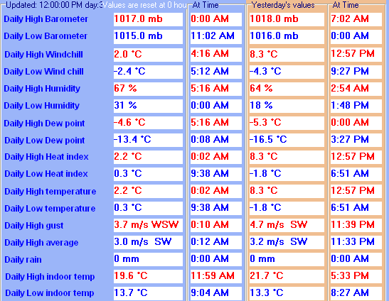Yesterdays rainfall | 3.0 mm | DewPoint | 13.5 °C (Wet Bulb :15.7 °C ) |